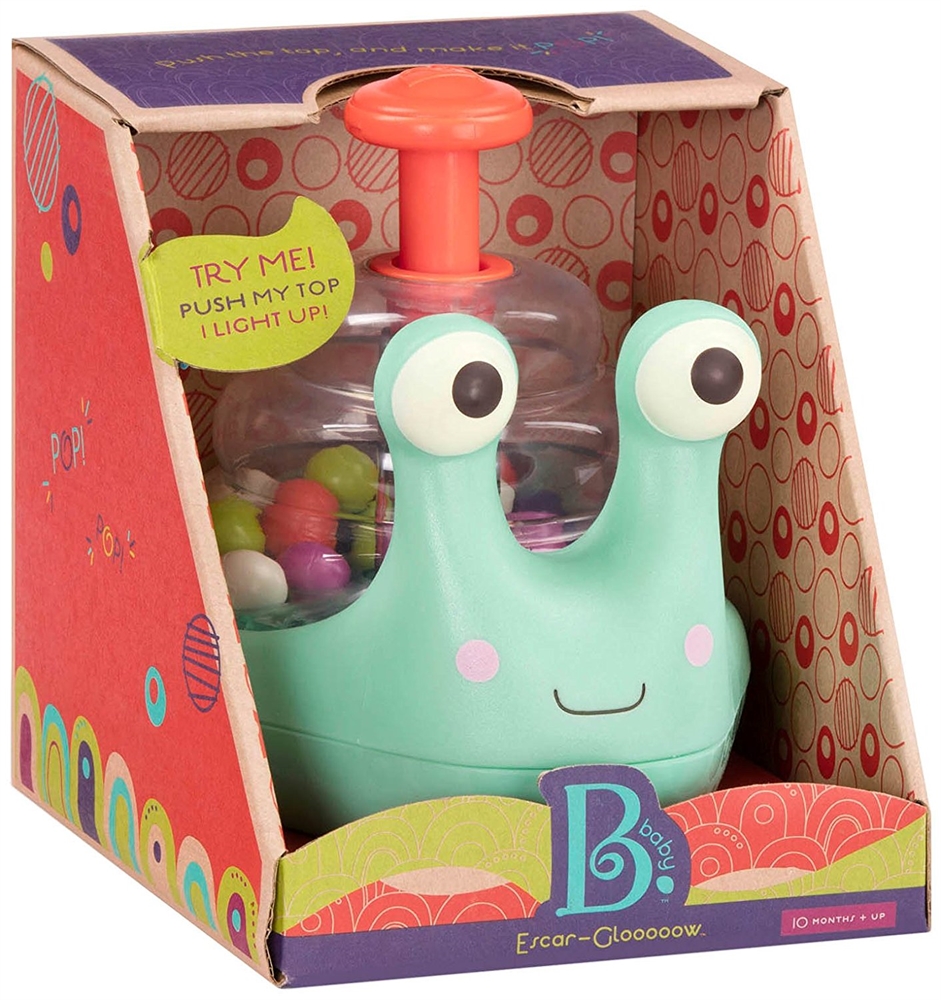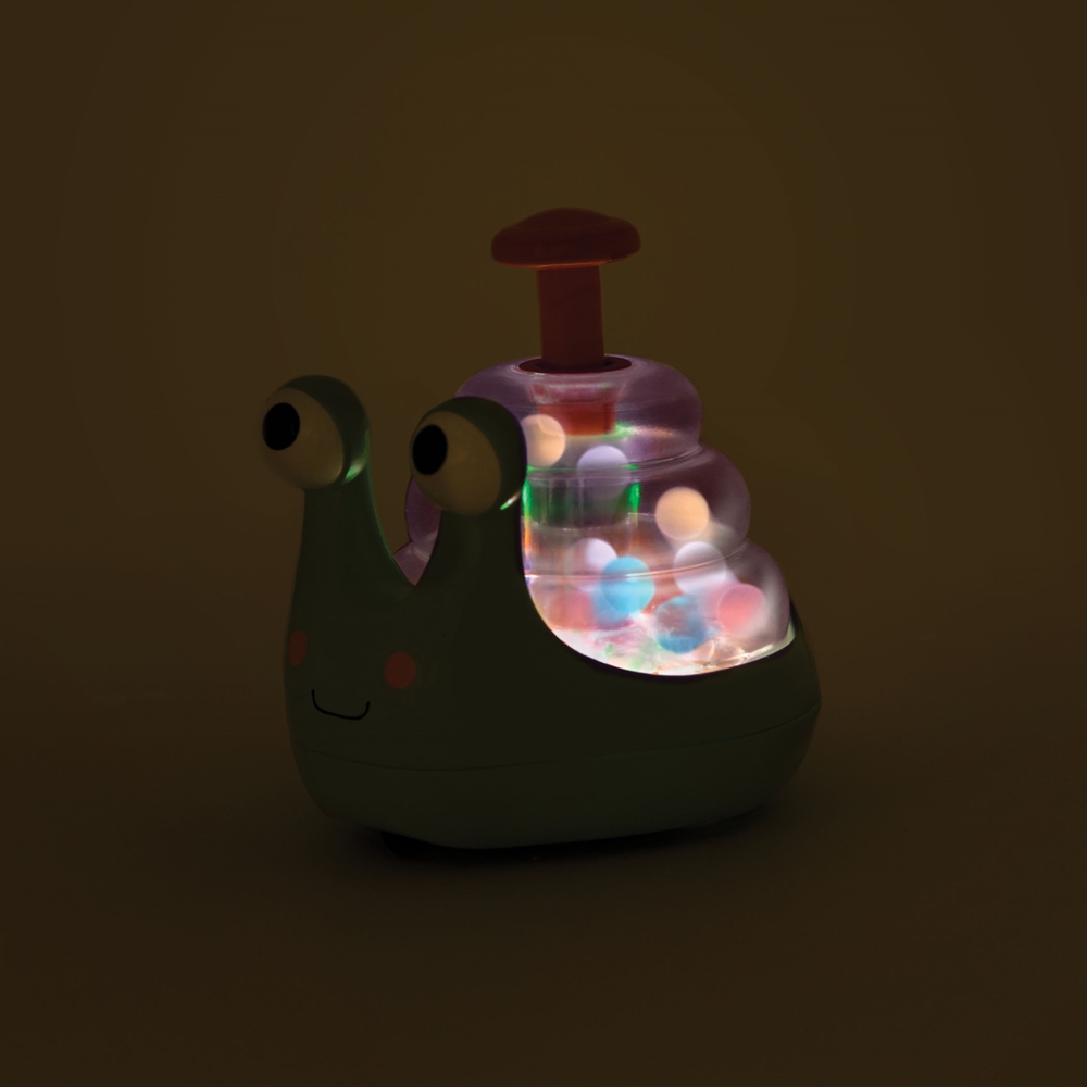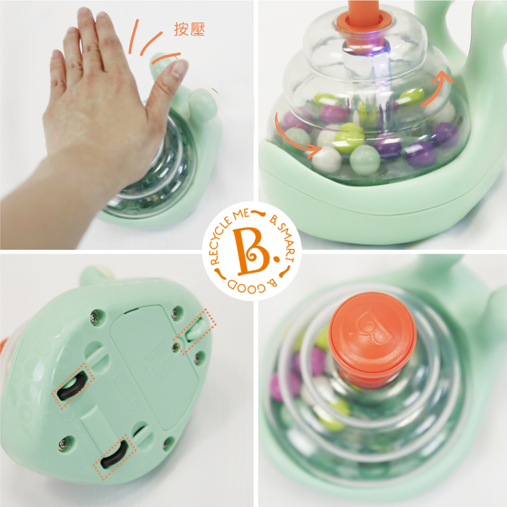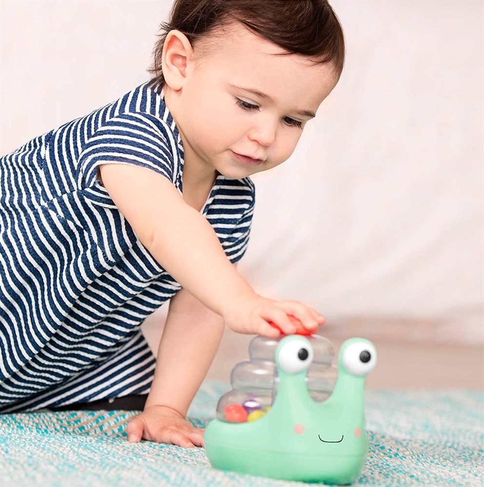 Melcul B.Toys este prevazut cu lumini stralucitoare si bile care sar cat mai sus si 3 roti pentru a stimula bebelusul sa faca primii pasi.