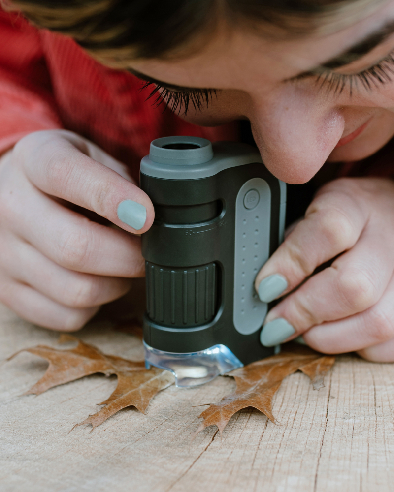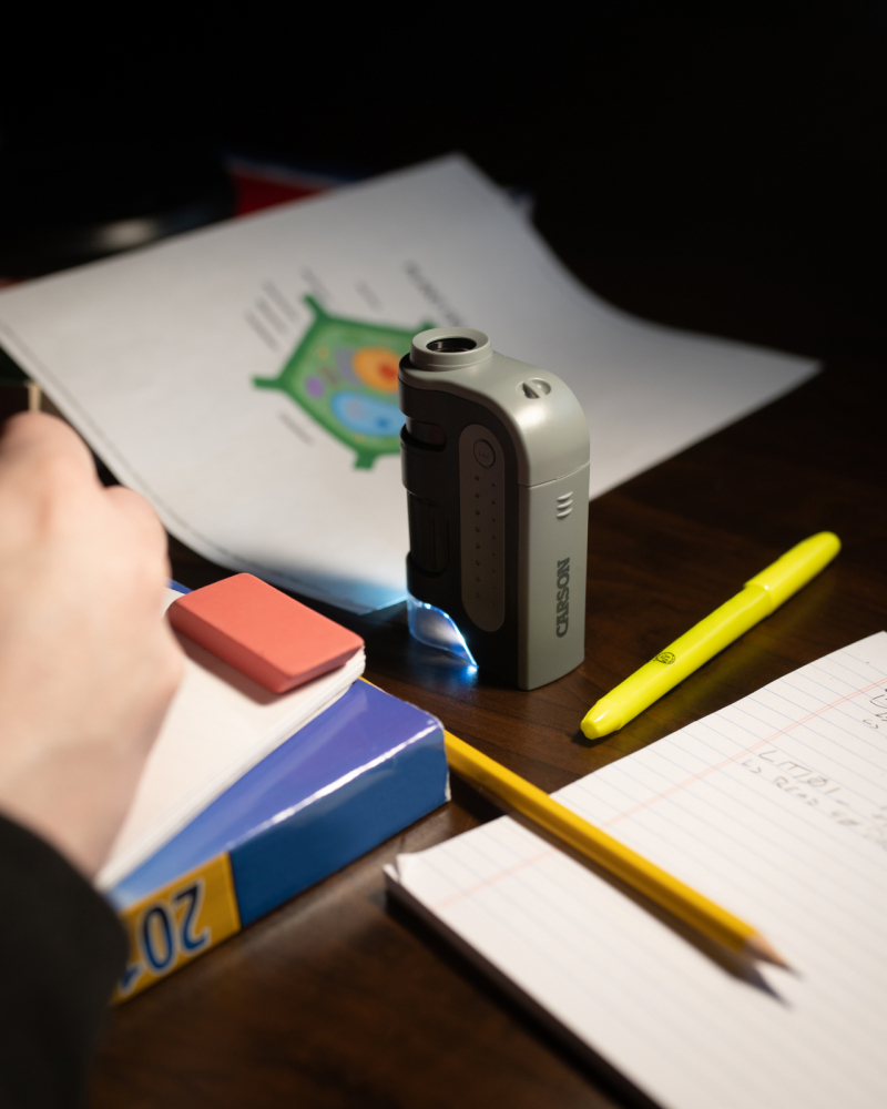 Acest microscop de buzunar dispune de o lumină LED încorporată care oferă o imagine luminoasă și clară.