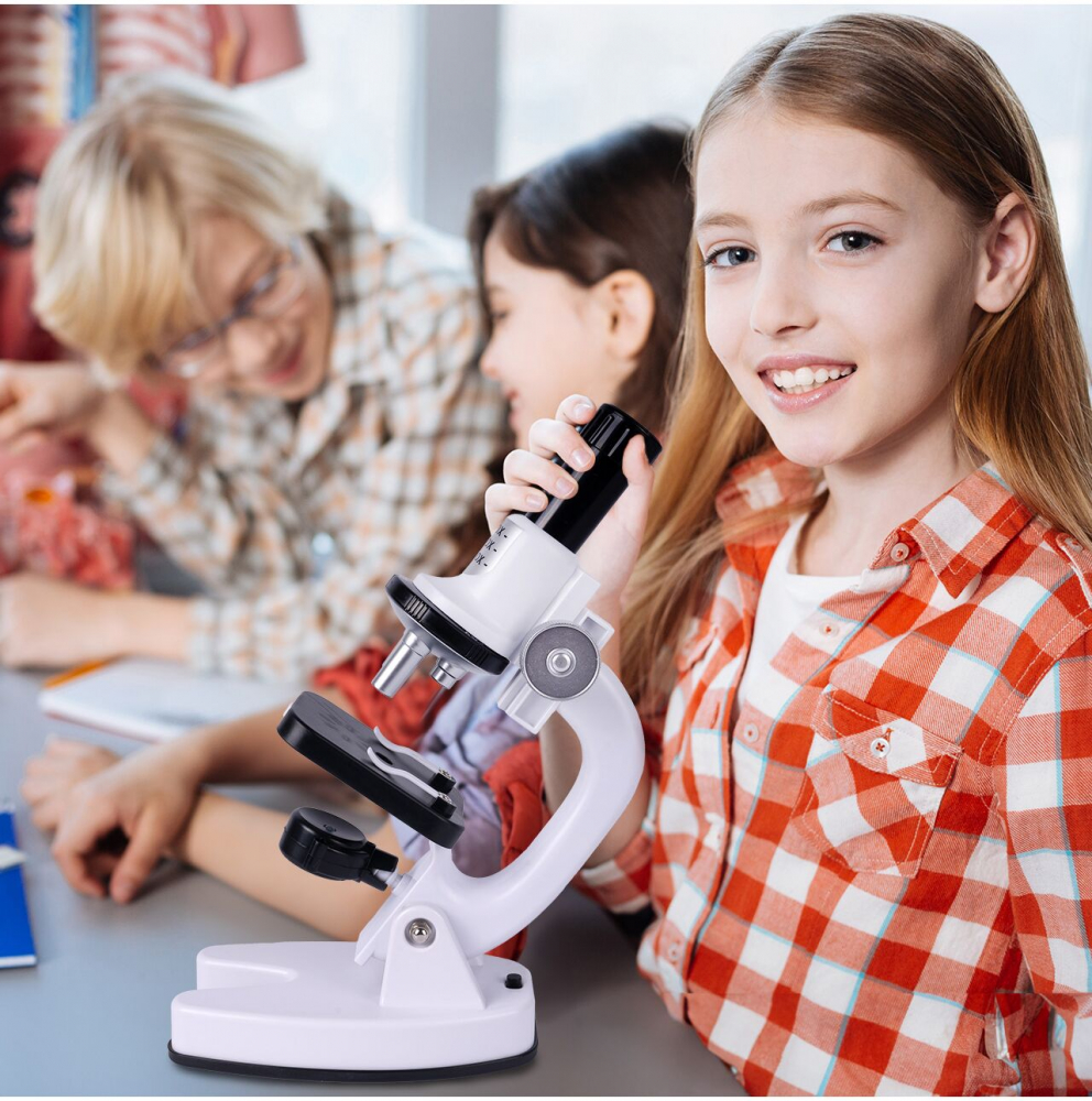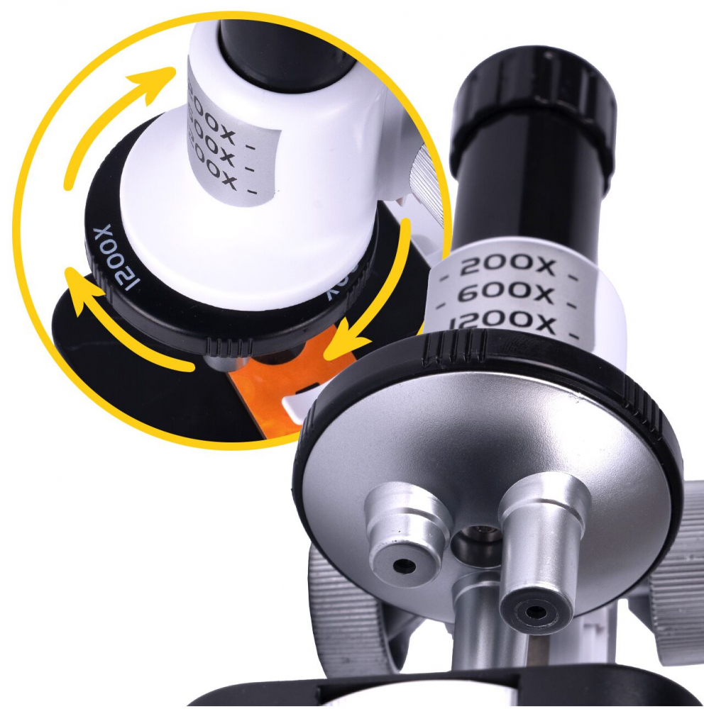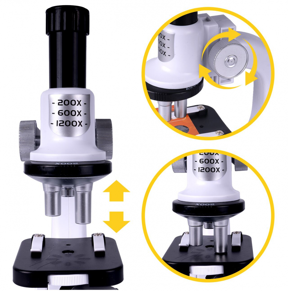 Microscop digital monocular pentru copii cu 3 nivele de marire 200x, 600x, 1200x, lumina led, montabil pe smartphone si 16 accesorii incluse