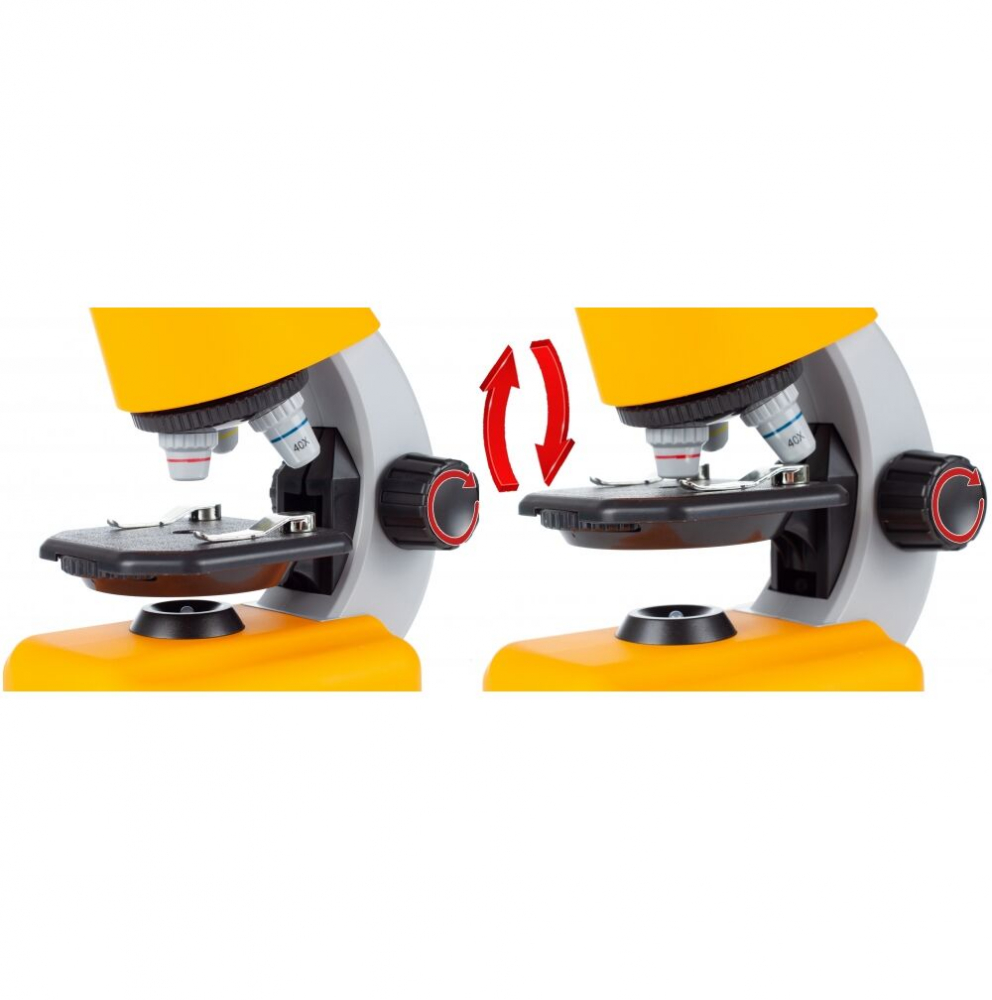 Setati obiectivul corect mutand revolverul. Apoi mutati surubul in timp ce priviti prin ocular pentru a regla inaltimea scenei pana cand imaginea este clara.