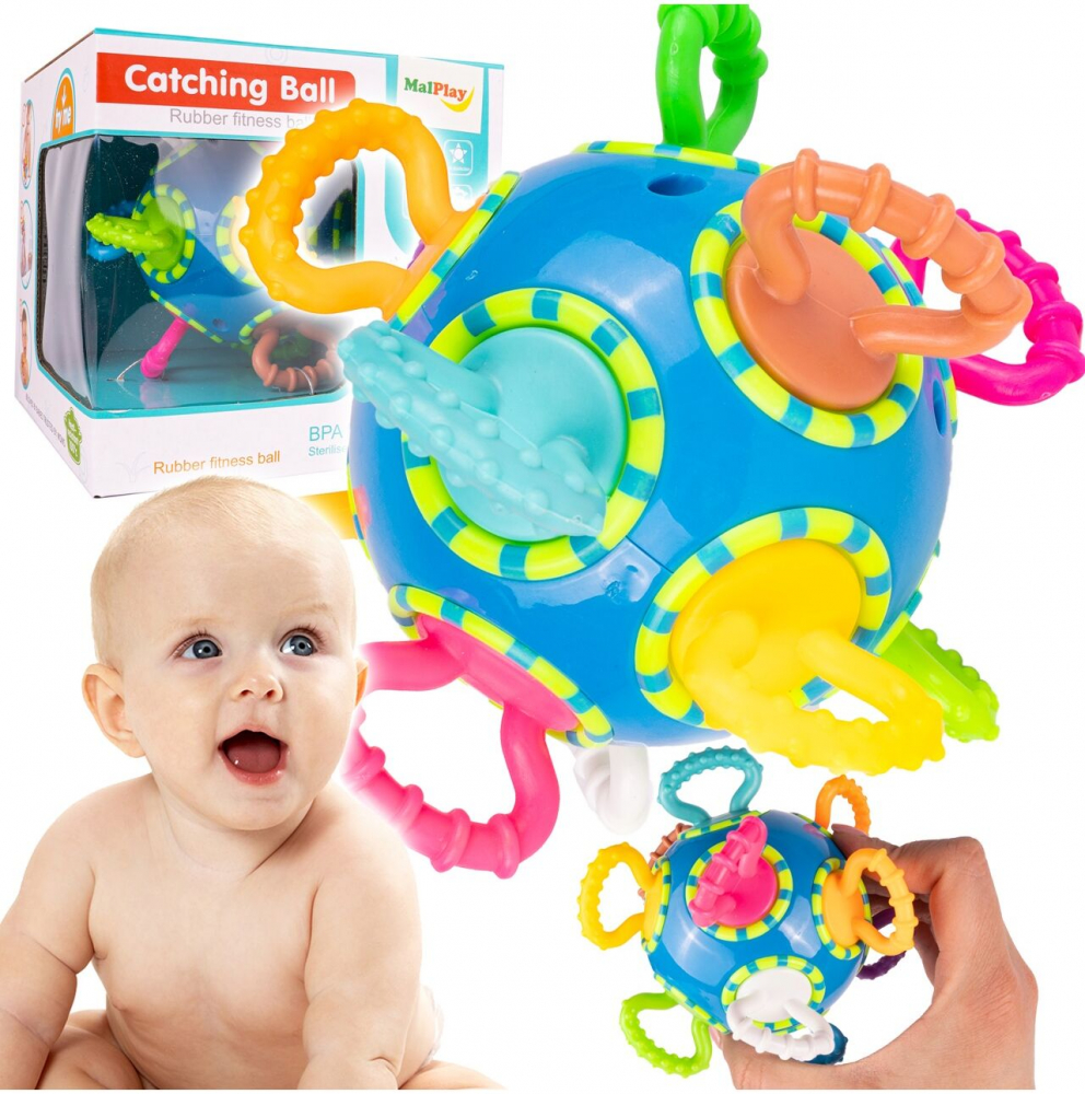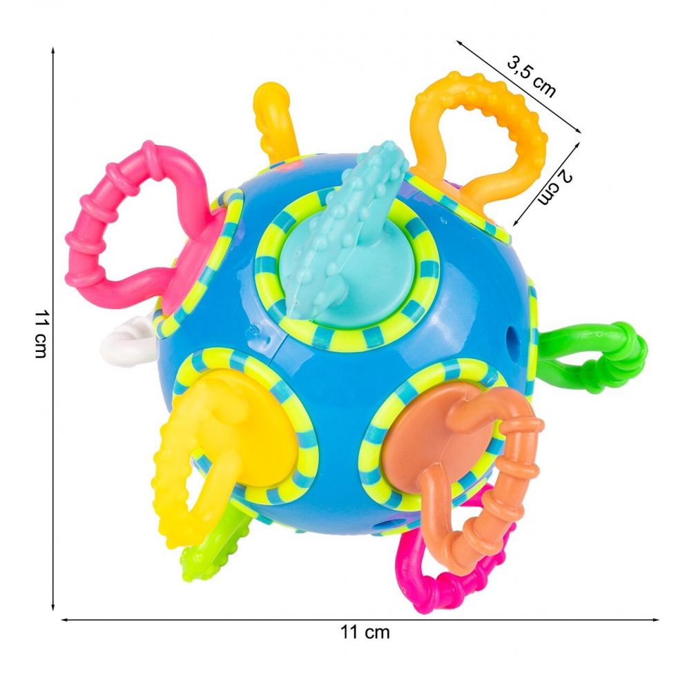 Minge senzoriala si de dentitie pentru bebelusi, cu Sunete, Texturi, elemente proeminente si mobile, Chei rotative 360, dimensiune 10.5 cm, Catching Ball Blue