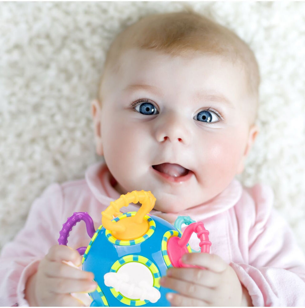 * Incurajeaza-ti copilul sa ajunga, sa apuce, sa scuture si sa rasuceasca . Pe fiecare parte a jucariei exista chei colorate care pot fi rotite la 360 de grade.