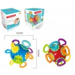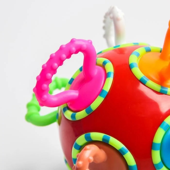 Minge senzoriala si de dentitie pentru bebelusi, cu Sunete, Texturi, elemente proeminente si mobile, Chei rotative 360, dimensiune 10.5 cm, Catching Ball Red