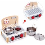 Aragazul de jucarie de la HAPE ocupa putin spatiu 25 x 23 cm dar contine 2 ochiuri pentru gatit impreuna cu o oala si o tigaie de inox, un ceas ajustabil, 2 butoane pentru pornit si oprit aragazi si o paleta si un polonic pentru gatit.