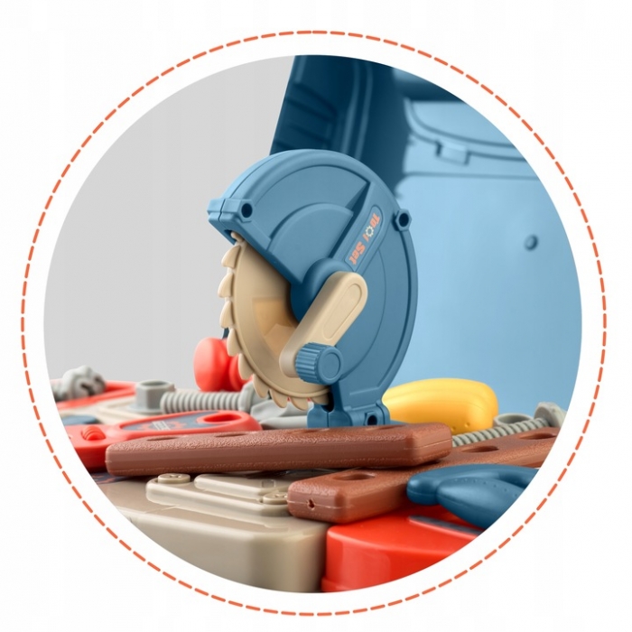 - Setul include numeroase elemente mobile (ferastrau circular, ciocan, cheie, surubelnita, ferastrau simplu si benzi de bricolaj) si un organizator detasabil.