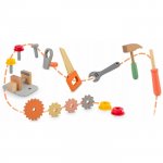 Setul include: ciocan, surubelnita, cheie, fierastrau, suruburi etc.