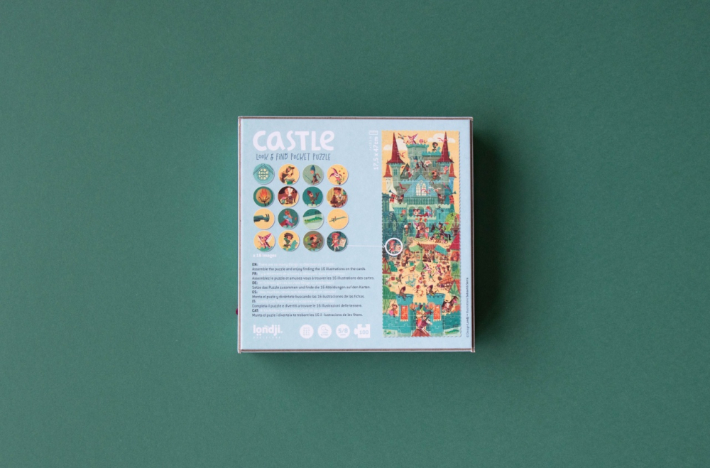Odată ce ai terminat puzzle-ul, începe aventura: caută personajele și secretele ascunse în castel! Găsește cavalerul, regele, bufonul, muzicantul și călugărul, alături de multe alte surprize!