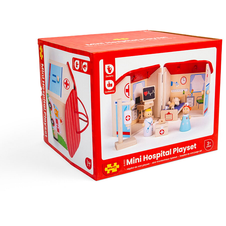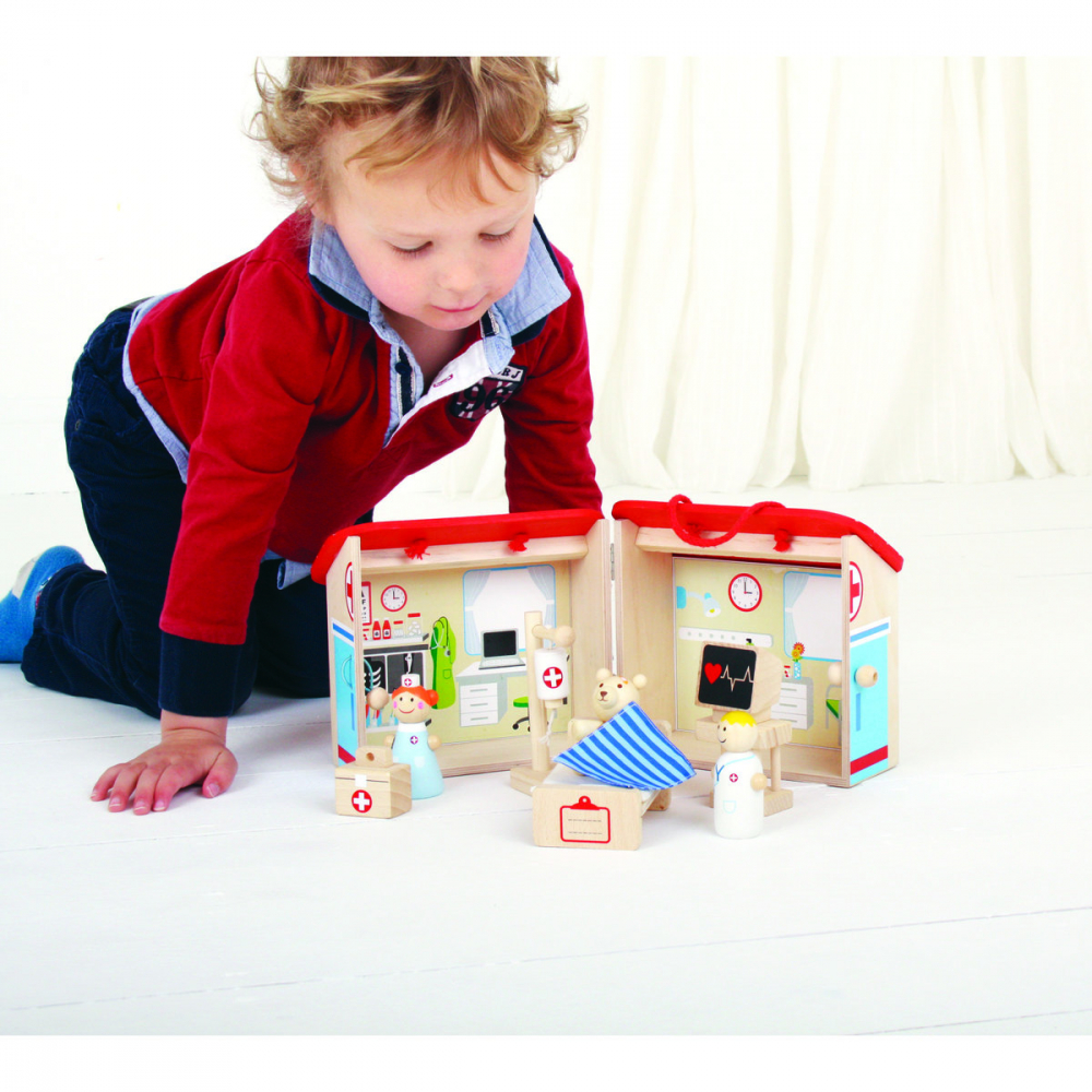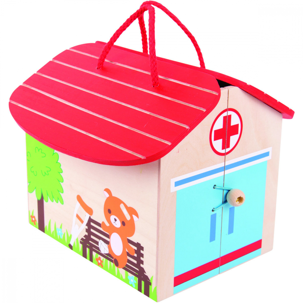 Suntem convinsi ca vei fi cel mai bun medic veterinar! Setul contine 9 piese din lemn, depozitate in cutiuta spital prevazuta cu maner pentru a facilita transportarea de catre cei mici.