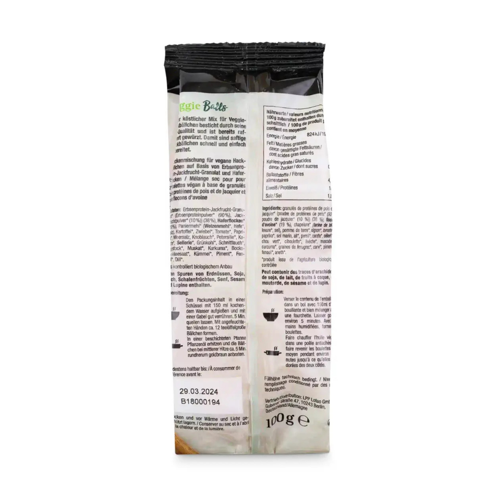 Ingrediente: Granule din Jackfruit si proteina de mazare 38% (pudra de proteina de mazare* 90%*, pudra de Jackfruit* 10%), fulgi de OVAZ* fin 19%, pesmet* (faina de GRAU*, drojdie*, Sare), cartofi*, ceapa*, rosii*, piper*, sare de mare, usturoi*, patrunjel*, morcov*, TELINA*, varza*, arpagic*, leustean*, nucsoara*, curcuma*, schinduf seminte* , chimen*, ienibahar*, fenicul*, marar*.