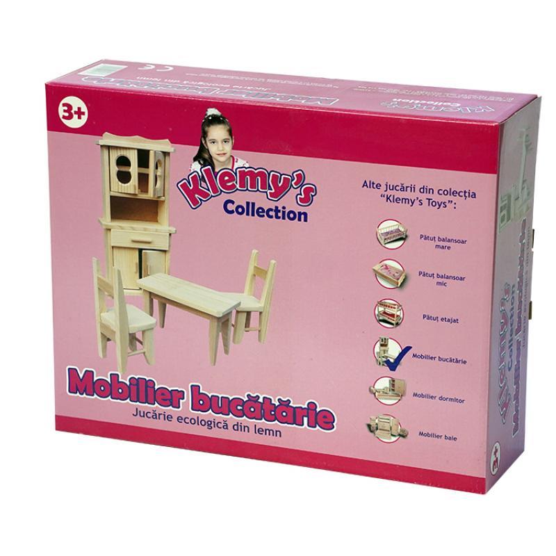 Mobilier bucatarie pentru papusi confectionat din lemn, vopsit in roz.