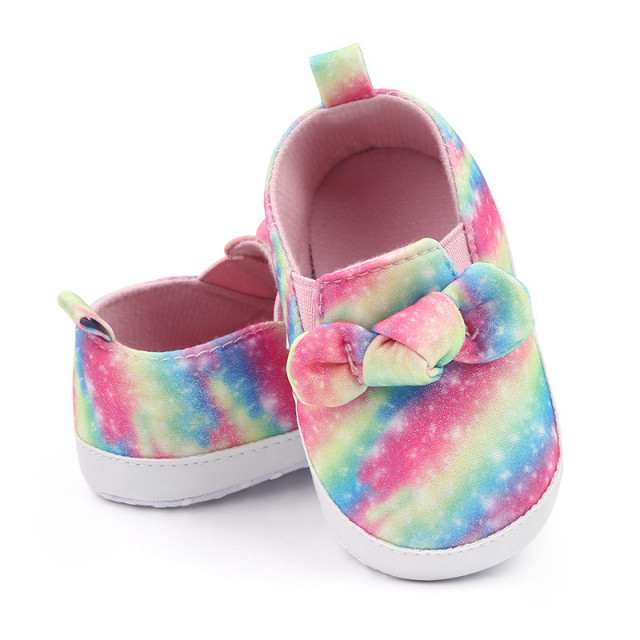 Pantofiori din material textil, in culorile curcubeului, prevazuti cu o fundita aplicata in fata.