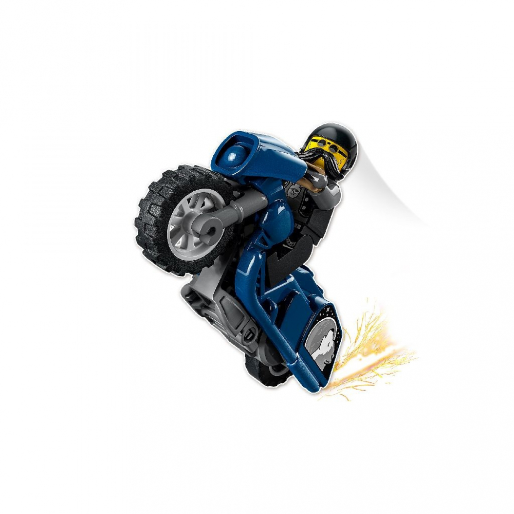 Ce e in cutie? - tot ce le trebuie copiilor pentru a construi o motocicleta de cascadorii echipata cu volanta si o minifigurina LEGO City Stuntz, The Lone Wolf Biker.