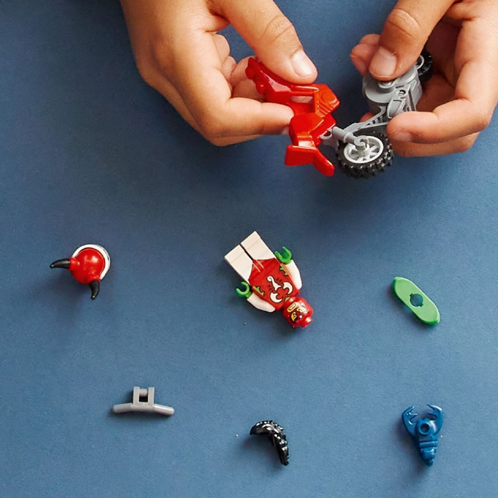 Ce e in cutie? - tot ce le trebuie copiilor pentru a construi o motocicleta de cascadorii echipata cu volanta si o minifigurina LEGO City Stuntz, Scorpion Luchadora si o figurina scorpion.