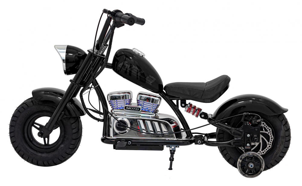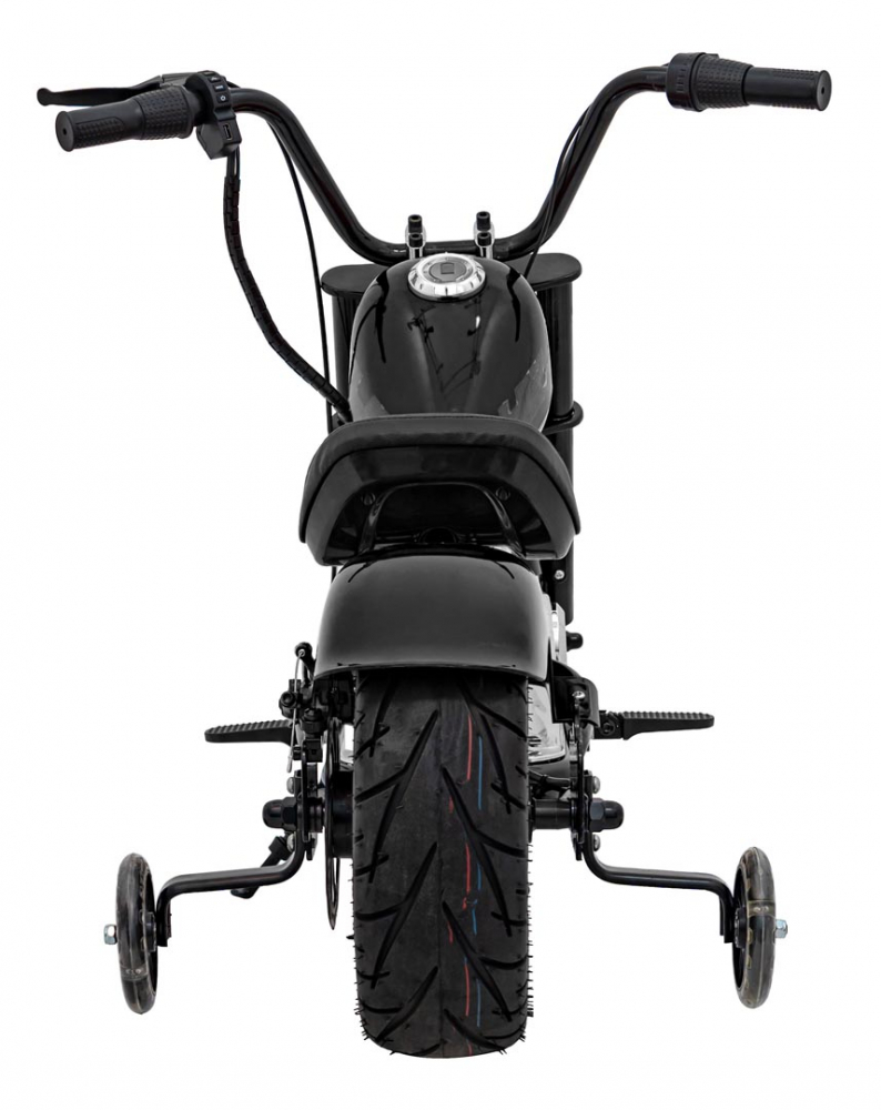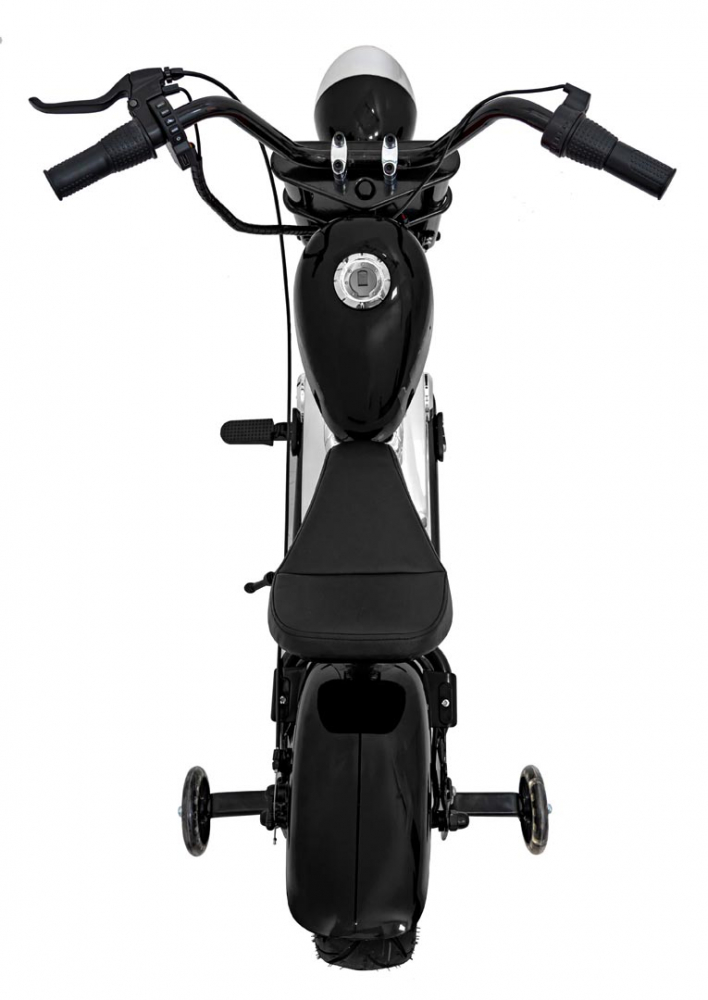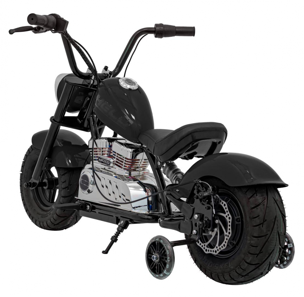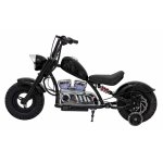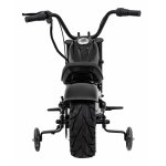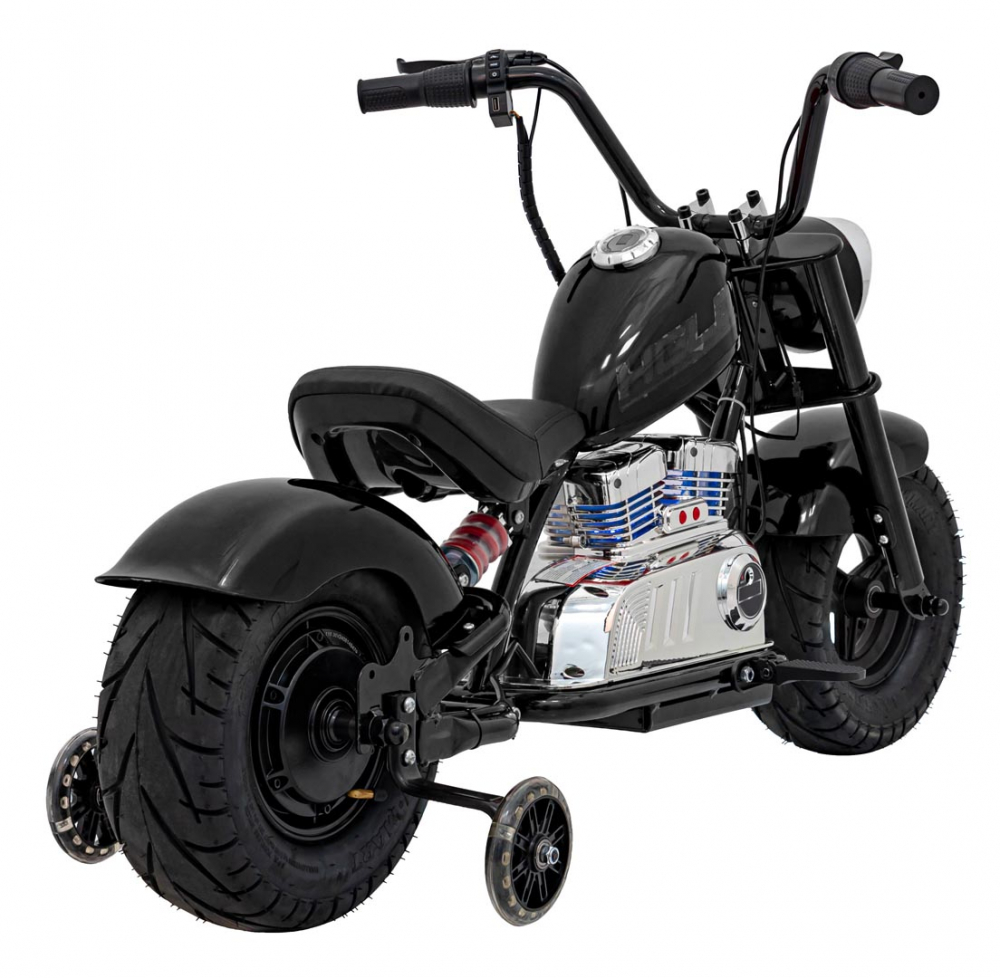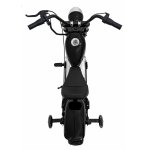 Motocicleta electrica pentru copii Chopper Warrior Black, motor de 350W, cu doua baterii de 18V9Ah, pornire prin buton, cu rotile gonflabile, panou audio integrat cu MP3, USB, lumini LED, sarcina maxima 80 kg