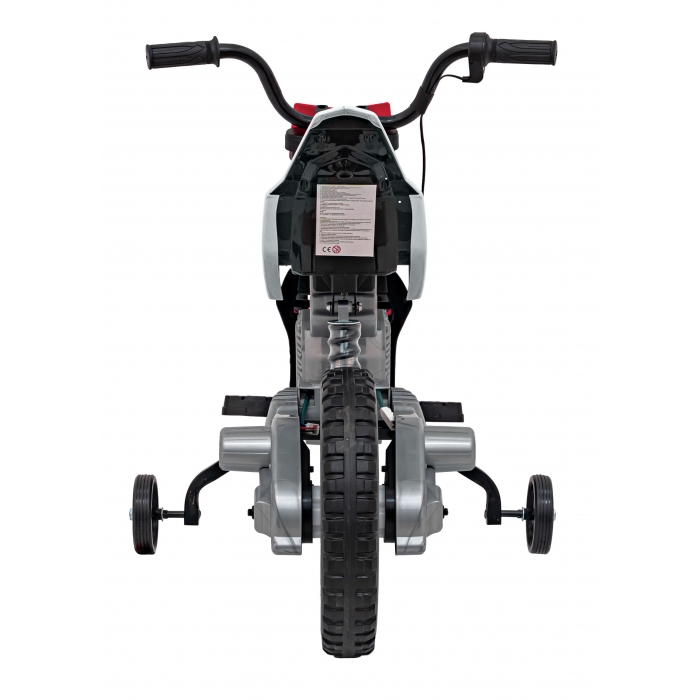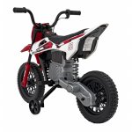 Motocicleta electrica pentru copii Pantone rosu 361C cu 2 roti ajutatoare, panou audio, pornire lenta, scaun piele si roti din spuma Eva, 108x59x72 cm