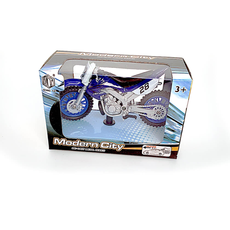 * Descriere macheta: motocicleta de teren fabricata din combinatie metal cu plastic, tip diecast, pneuri din cauciuc, propulsie manuala;