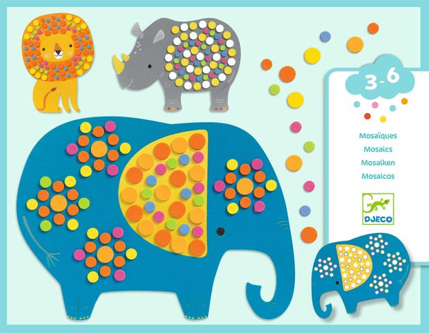 Jocul conține: 3 planșe preilustrate (elefant, leu, rinocer), 10 coli de burete colorat, divizate în aprox 300 cuburi-mozaic, manual instrucțiuni.