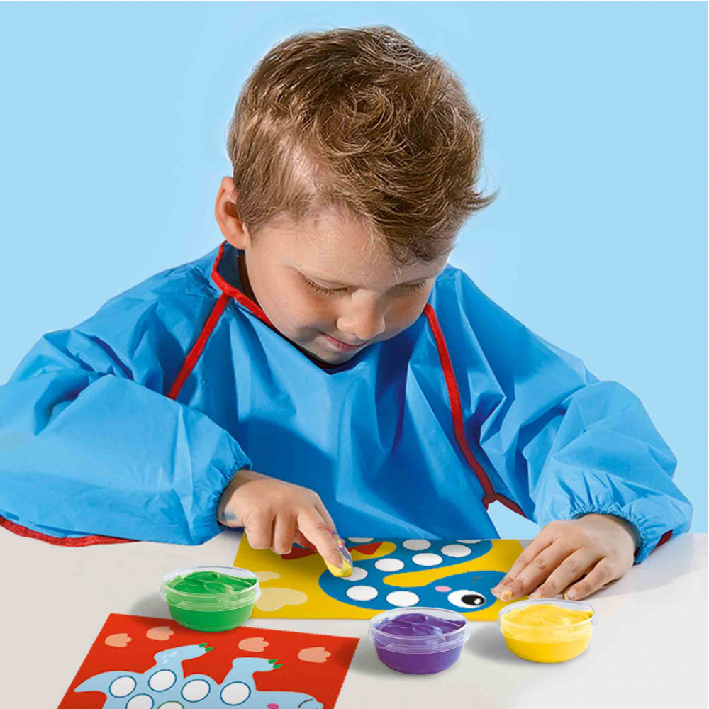 Copiii pot decora diferitii dinozauri asa cum doresc, folosind degetele pentru a stampila sau a unge.