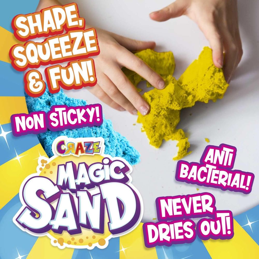 Nisipul magic CRAZE isi pastreaza forma si nu se usuca, este antibacterian, nu miroase, nu se lipeste de maini si este usor de indepartat de pe haine si obiecte.