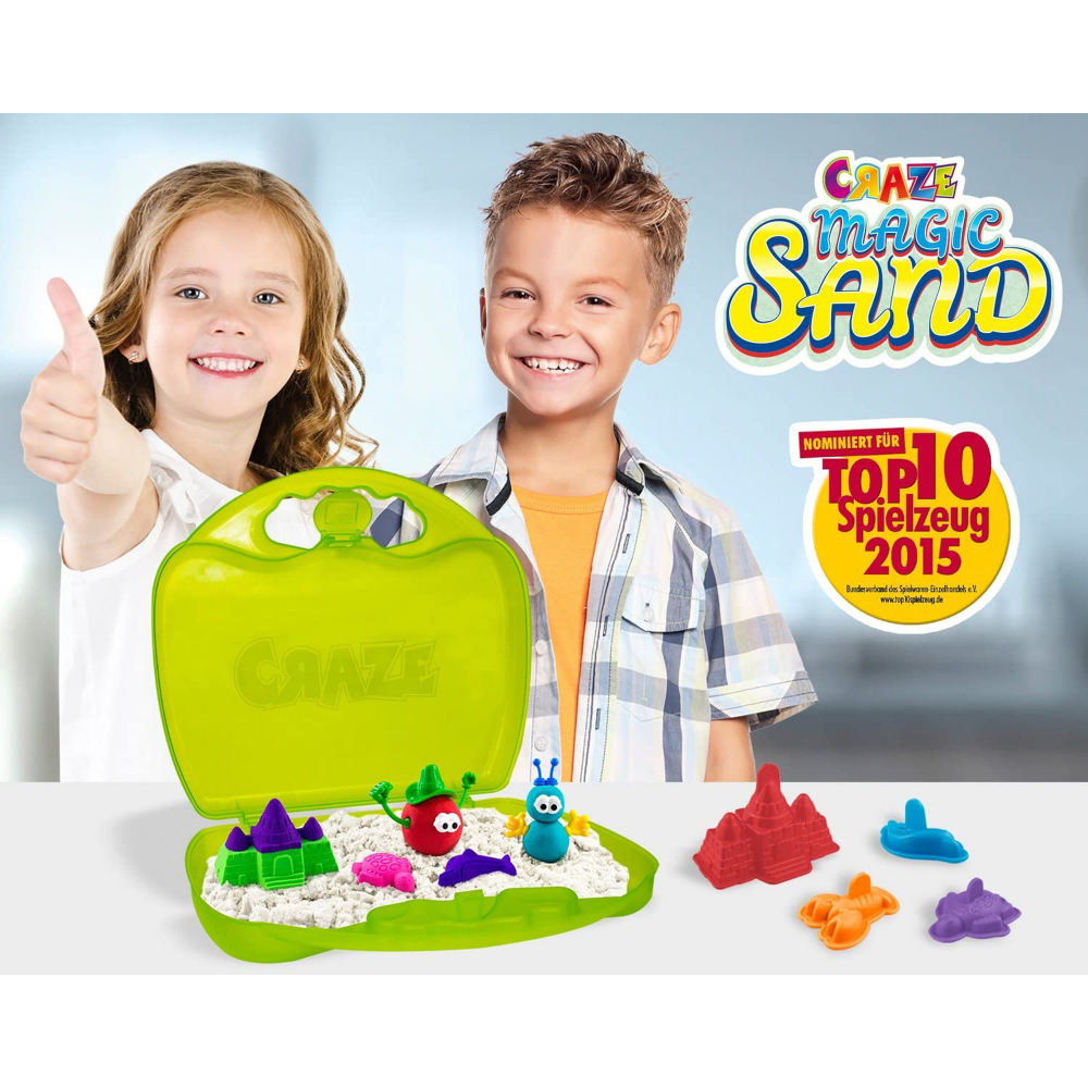 NISIP KINETIC - SET PORTABIL de la Craze contine 700 g denisip magic original in culori asortate, 4 forme grozave pentru nisip, accesorii si unealta pentru construirea formelor de nisip.