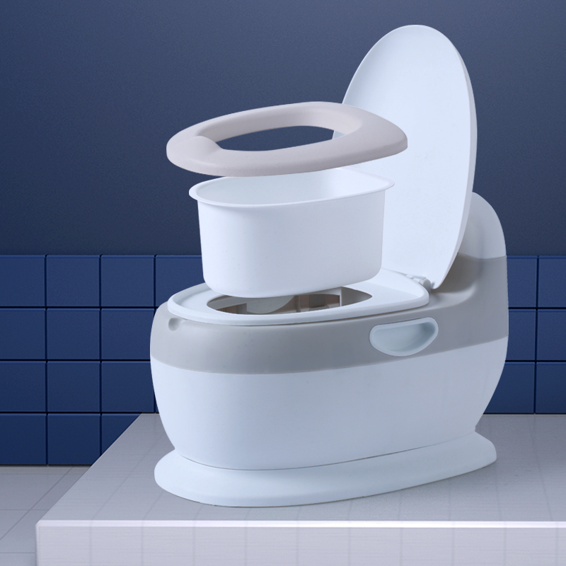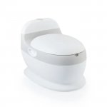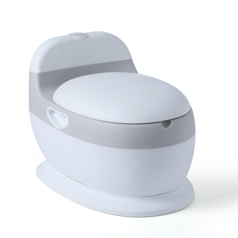 Olita pentru copii Little Mom Grey Toilet, model educativ si muzical, cu design realist, colac moale din spuma PU, capac rabatabil si vas colector detasabil, dimensiune 40 x 28 x 30 cm