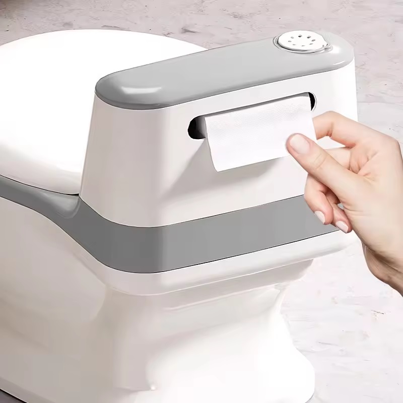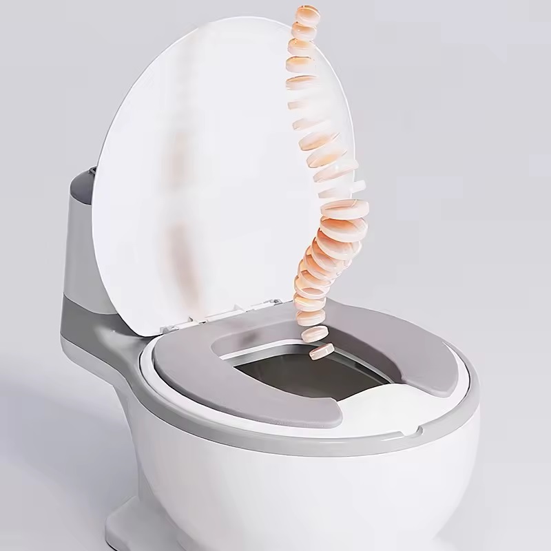 - Suntete interesante pentru copii: la apasarea butonului specific, olita va emite sunete de „eliberare a apei”.