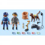 Porneste in urmarire cu acest set captivant PLAYMOBIL! Hotul viclean isi ascunde prada sub dealul stancos, dar cainele politist cu nas fin si detectorul de metale sunt pe urmele lui.