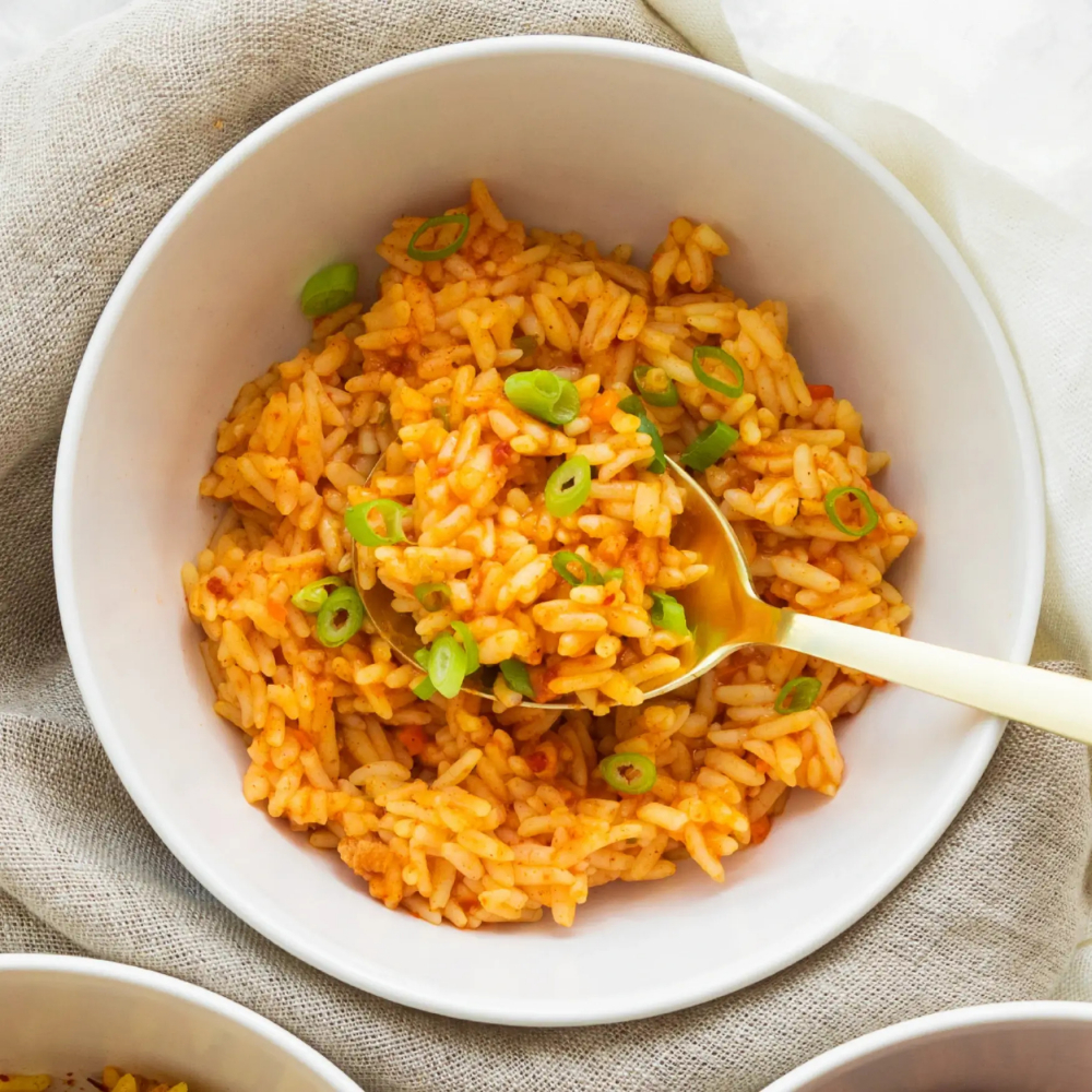 Ingrediente: Orez cu bob lung* pre-gatit 70% (Italia), zahar din trestie de zahar*, amidon de tapioca*, rosii*, sare de mare, condimente*, granule de lamaie* (concentrat de suc de lamaie*, amidon de porumb*), agent de ingrosare: guma de guar*, Jackfruit* liofilizat 1%, morcovi*, ananas*, ardei*, ceapa*, praz*.
