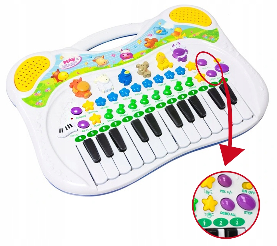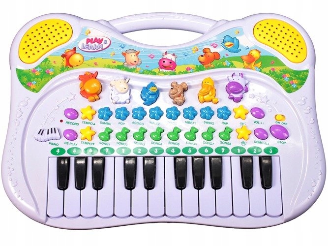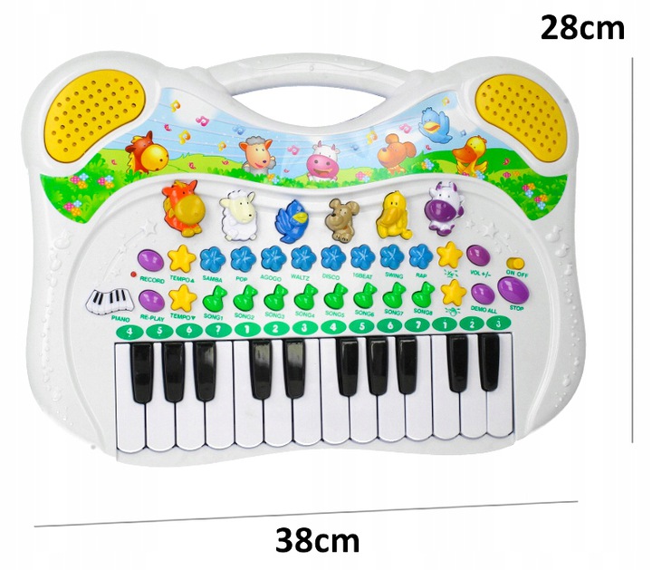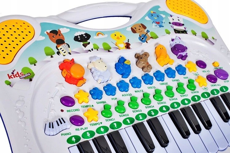 Orga muzicala are 24 de clape si 32 de butoane functionale, 8 melodii, 8 ritmuri, 8 sunete de animale si un cantec demo, buton pornire-oprire, maner prindere, functie pian, reda diverse melodii, imita animale, genuri de muzica, are functie de inregistrare-redare, reglare tempo si volum, multe cantece, sunete foarte placute, poti inregistra si auzi propriile compozitii.