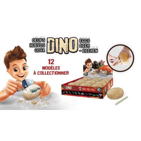 Contine: un singur ou cu o figurina dinozaur si o dalta ambalate individual in punguta de plastic.