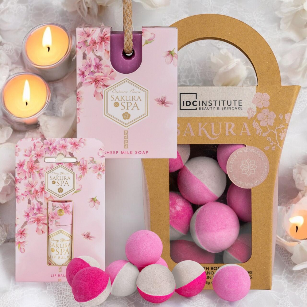 Explozie de culoare, aroma si spuma in cada. Coloreaza apa cu setul de bile solubile Sakura, cu aroma de flori de cires, de la IDC Institute.