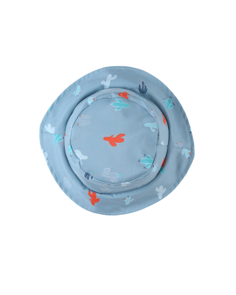 Această pălărie reversibilă are o parte aqua închisă cu imprimeu de cactus și o parte albastră.