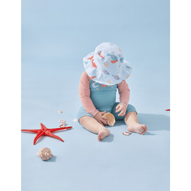 Cel mai bun aliat pentru a-ti proteja copilul de soare! Aceasta palarie de un albastru deschis cu imprimeuri de animale de mare este accesoriul indispensabil pentru a proteja copiii de soare vara!