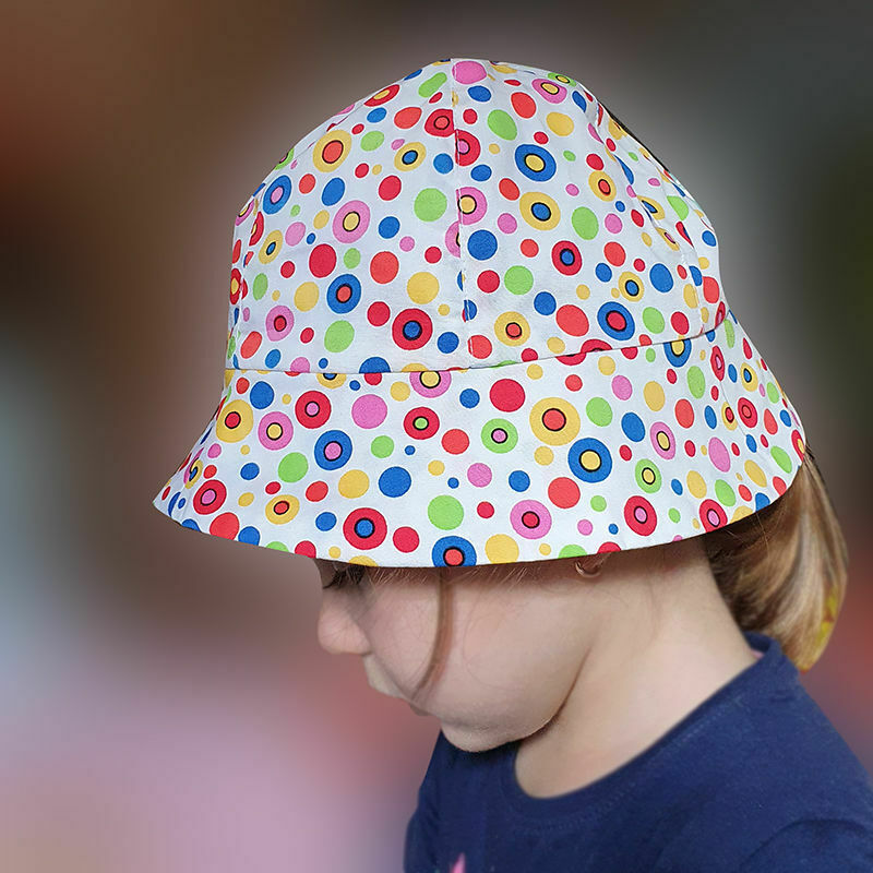 Alege aceasta palarie cu boruri mici ca sa o protejezi pe fetita ta de expunerea prelungita la soare - protectia solara este data de densitatea tesaturii de bumbac si de culori.