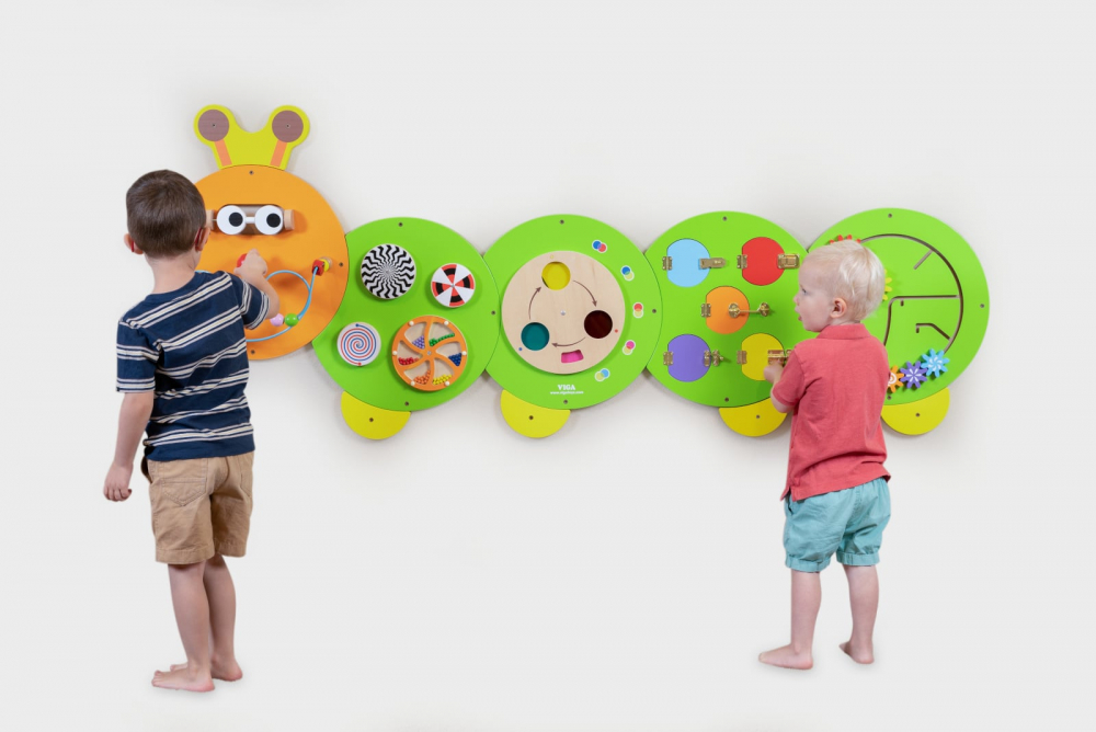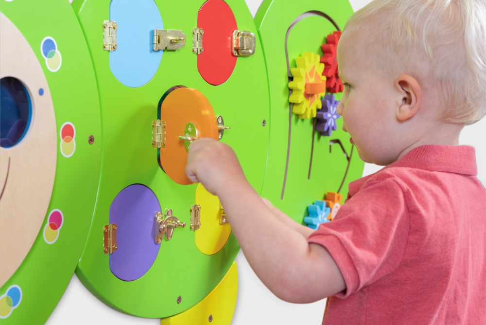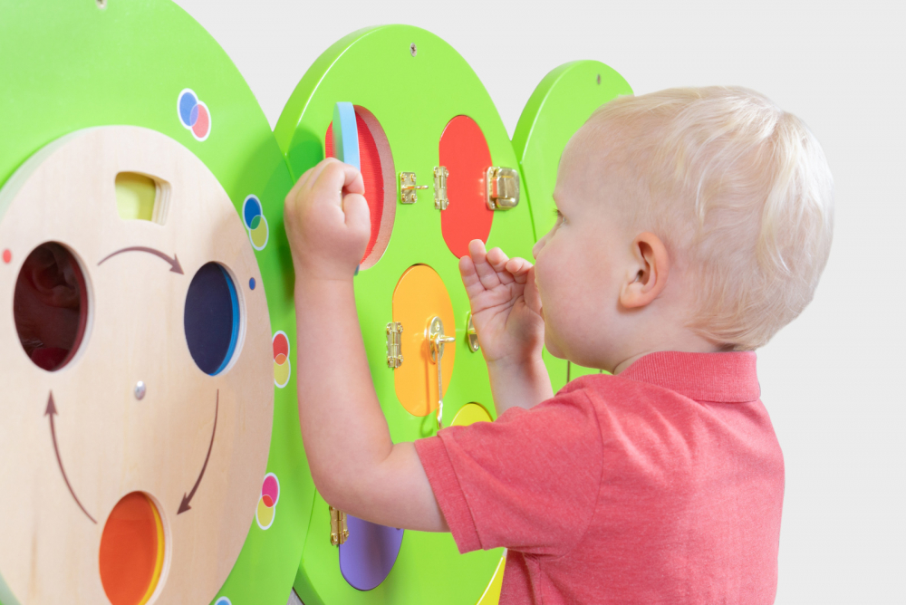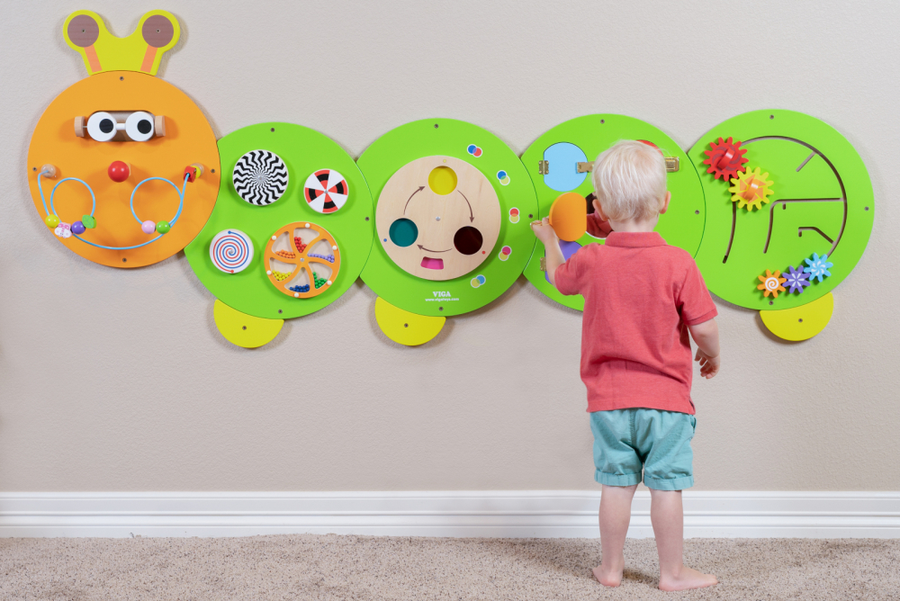 Jucărie de perete din lemn cu cinci secțiuni, fiecare cu un set diferit de activități de manipulare pentru a încuraja coordonarea mână-ochi și motricitatea fină, conține ochi care se învârt, discuri rotative, roata de culori primare, încuietori și prinderi și un puzzle cu unelte care se blochează.