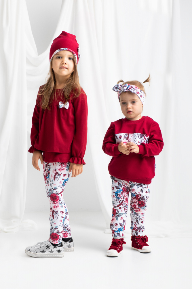 Pantalon cu imprimeu floral pentru copii. Imprimeul este realizat cu vopsele pe baza de apa, rezistente si sigure pentru pielea copilului.