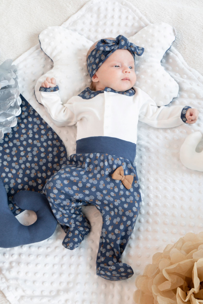 Romper pentru bebelusi cu model decorativ. Banda elastica, lata, necompresiva de la brau fixeaza produsul in locul corect, iar forma anatomica il face confortabil pentru copil. Cusatura speciala peste calcaie impiedica alunecarea in timpul jocului. Poate fi combinat cu alte articole din colectia "Sonia".