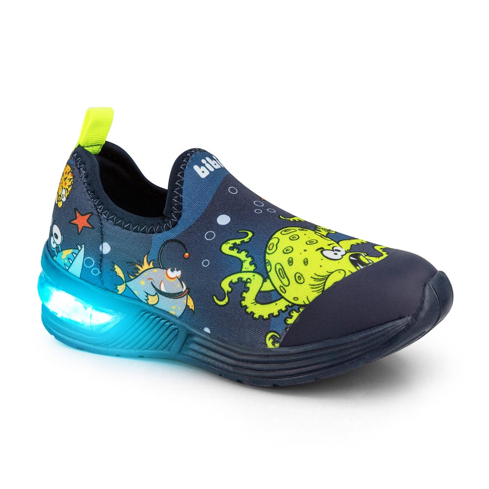 Pantofi sport cu model marin ce garanteaza distractia pentru cei mici. Sistemul exclusiv de lumini LED nu necesita incarcare, datorita bateriei garantata 200.000 cicluri. Sunt confortabili si usor de incaltat datorita materialului exterior din textil.