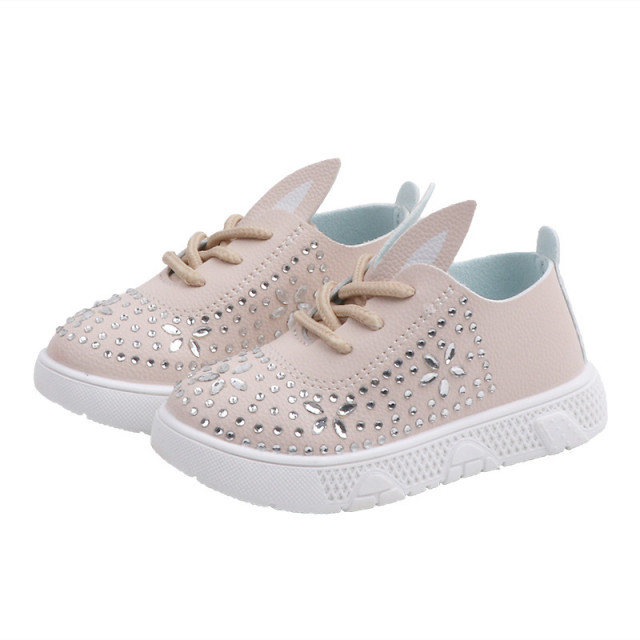 Pantofiori pentru fetite, din material tip piele ecologica, cu strasuri aplicate, se inchid cu sireturi.