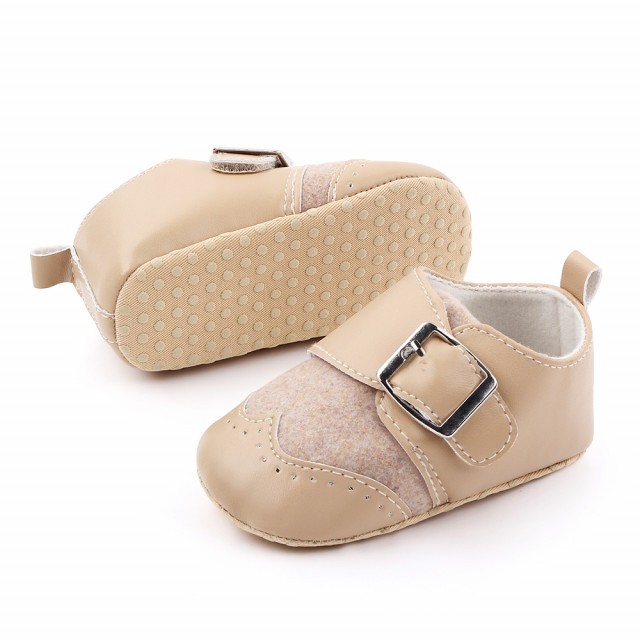 Pantofiori pentru bebelusi, din material tip piele intoarsa cu insertie de material tip piele ecologica. Se inchid cu bareta cu arici intr-o parte pe care este aplicata o catarama. Sunt potriviti pentru tinutele elegante ale micutului.
