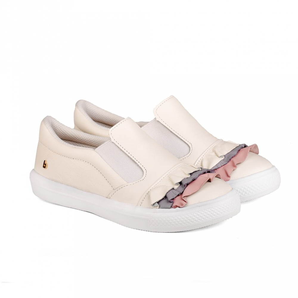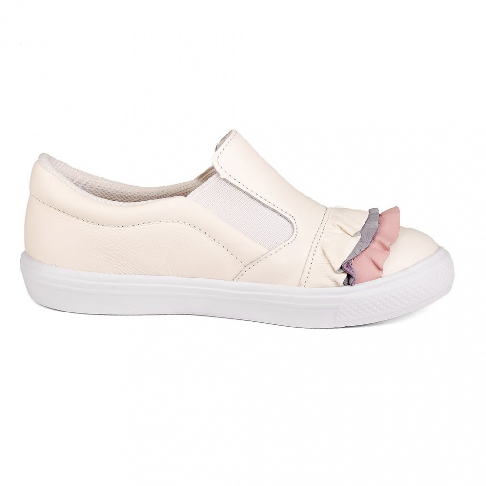 Pantofi casual pentru fete confectionati din piele moale, cu volane colorate.