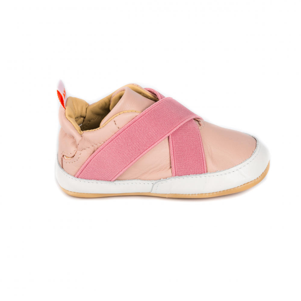 Pantofi roz cu captuseala, brant si exterior din piele. Au un sistem elastic exclusiv in calcaiul incaltamintei care faciliteaza fixarea si barete elastice peste picior.