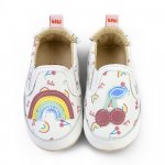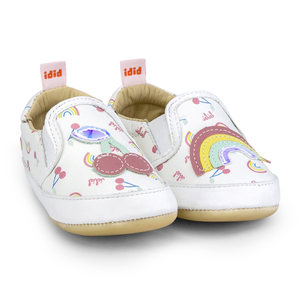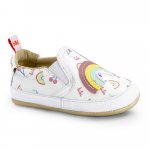 Pantofi albi cu model curcubeu cu captuseala, brant si exterior din piele. Au un sistem elastic exclusiv in calcaiul incaltamintei care faciliteaza fixarea.
