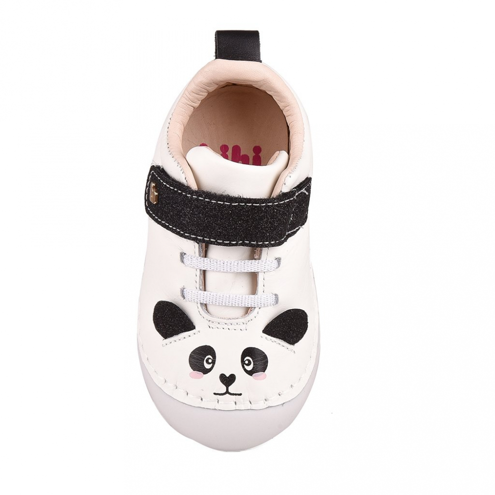 Pantofiori din piele, cu model Panda cu sclipici, dezvoltati pentru a oferi maximum de libertate, confort si protectie in etapa de incepere a mersului.