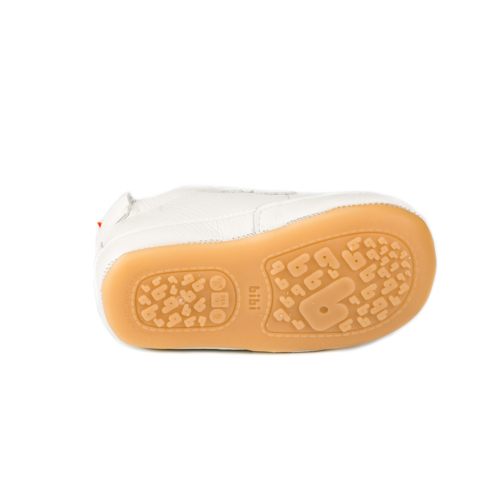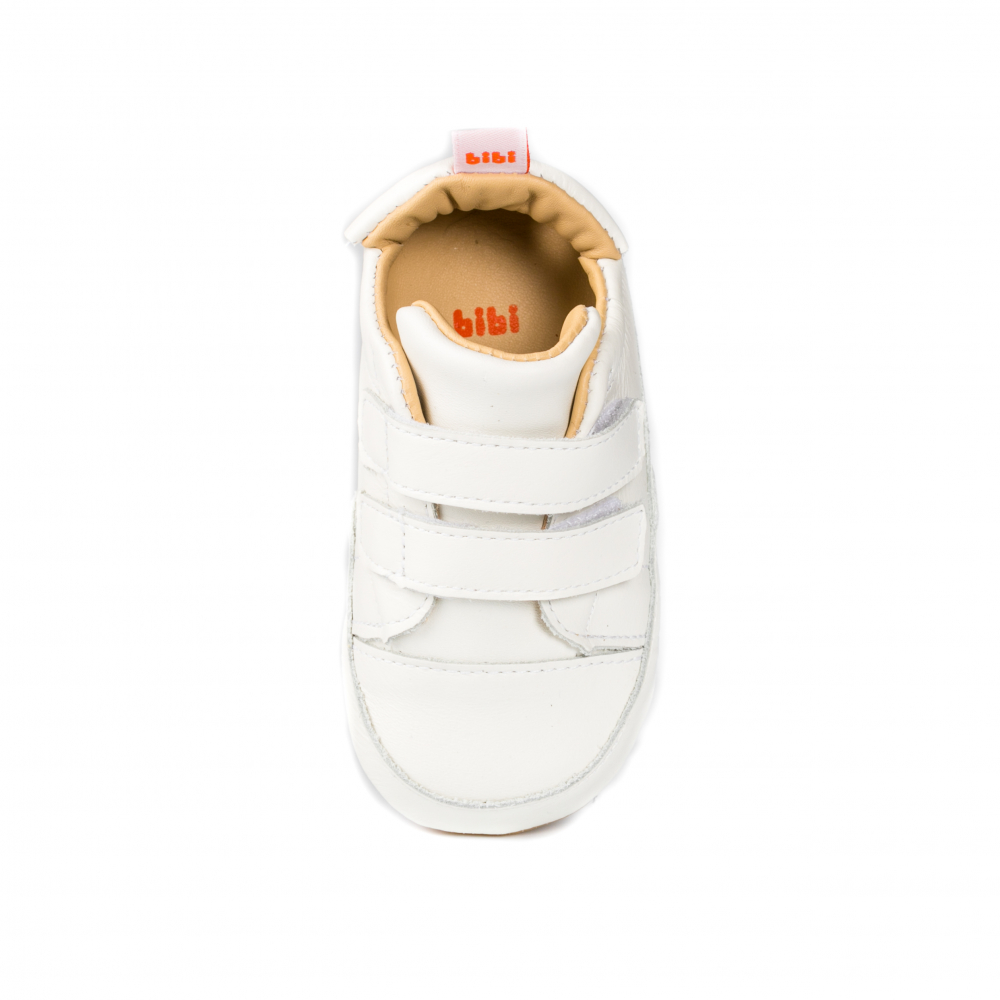 Pantofi albi pentru bebelusi cu captuseala, brant si exterior din piele. Au un sistem elastic exclusiv in calcaiul incaltamintei care faciliteaza fixarea si inchidere cu velcro, pentru o incaltare usoara.