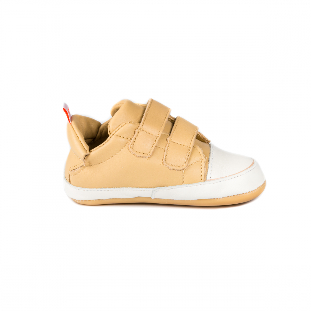 Pantofi nude pentru bebelusi cu captuseala, brant si exterior din piele. Au un sistem elastic exclusiv in calcaiul incaltamintei care faciliteaza fixarea si inchidere cu velcro, pentru o incaltare usoara.