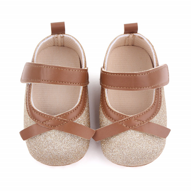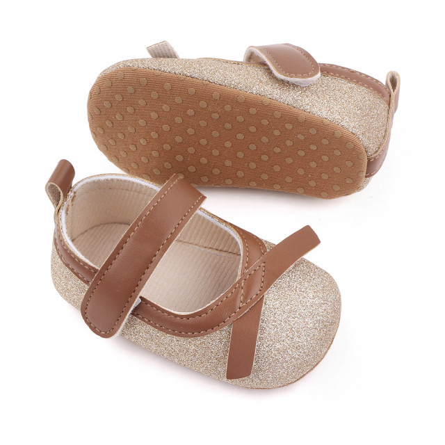 Pantofiori pentru fetite din material textil, cu sclipici si cu margini maro. Se inchid cu bareta cu arici intr-o parte.