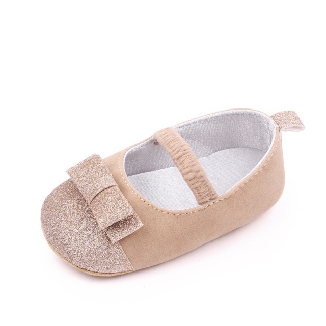 Adauga un plus de stralucire tinutei micutei tale cu acesti pantofiori crem, cu varfuri si fundite sclipitoare.