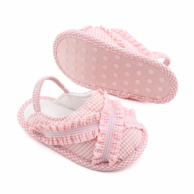 Pantofiori pentru fetite din material textil, cu carouri si cu volanase. Sunt decupati la spate si sunt prevazuti cu elastic.