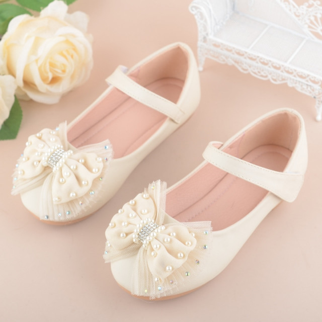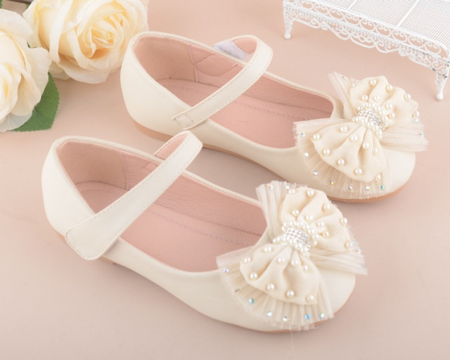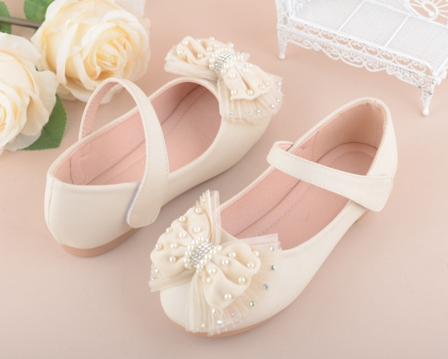 Pantofiori pentru fetite, potriviti pentru tinutele speciale ale micutelor domnisoare, cu o fundita cu perlute si strasuri aplicata in fata. Se inchid cu bareta cu arici intr-o parte.
